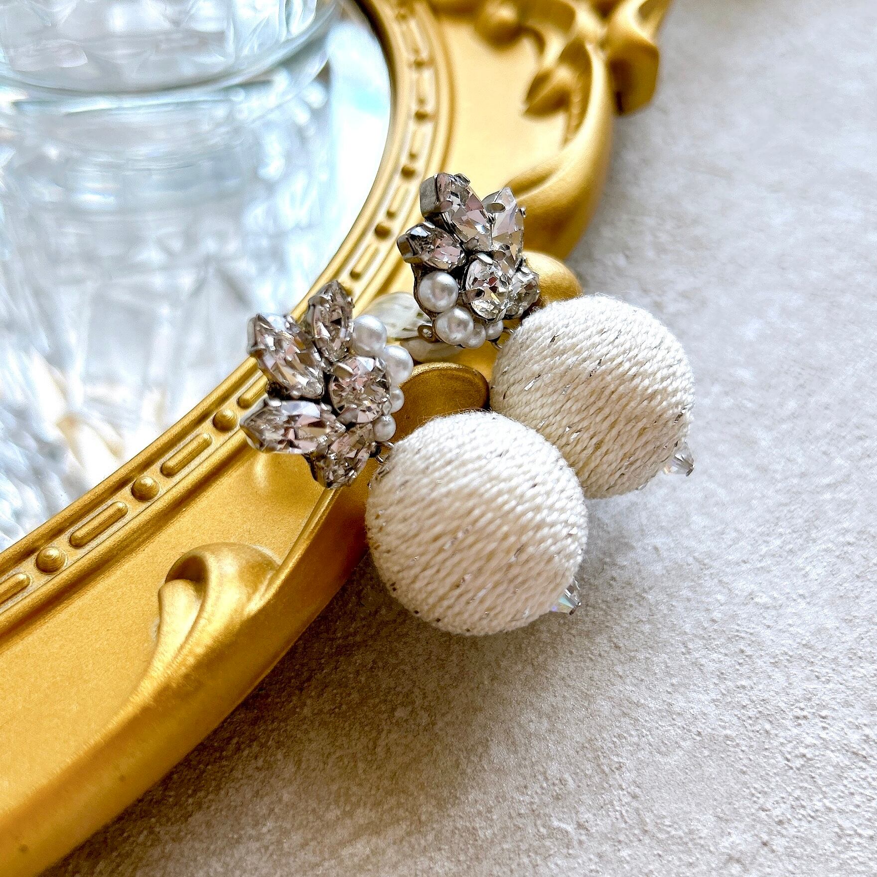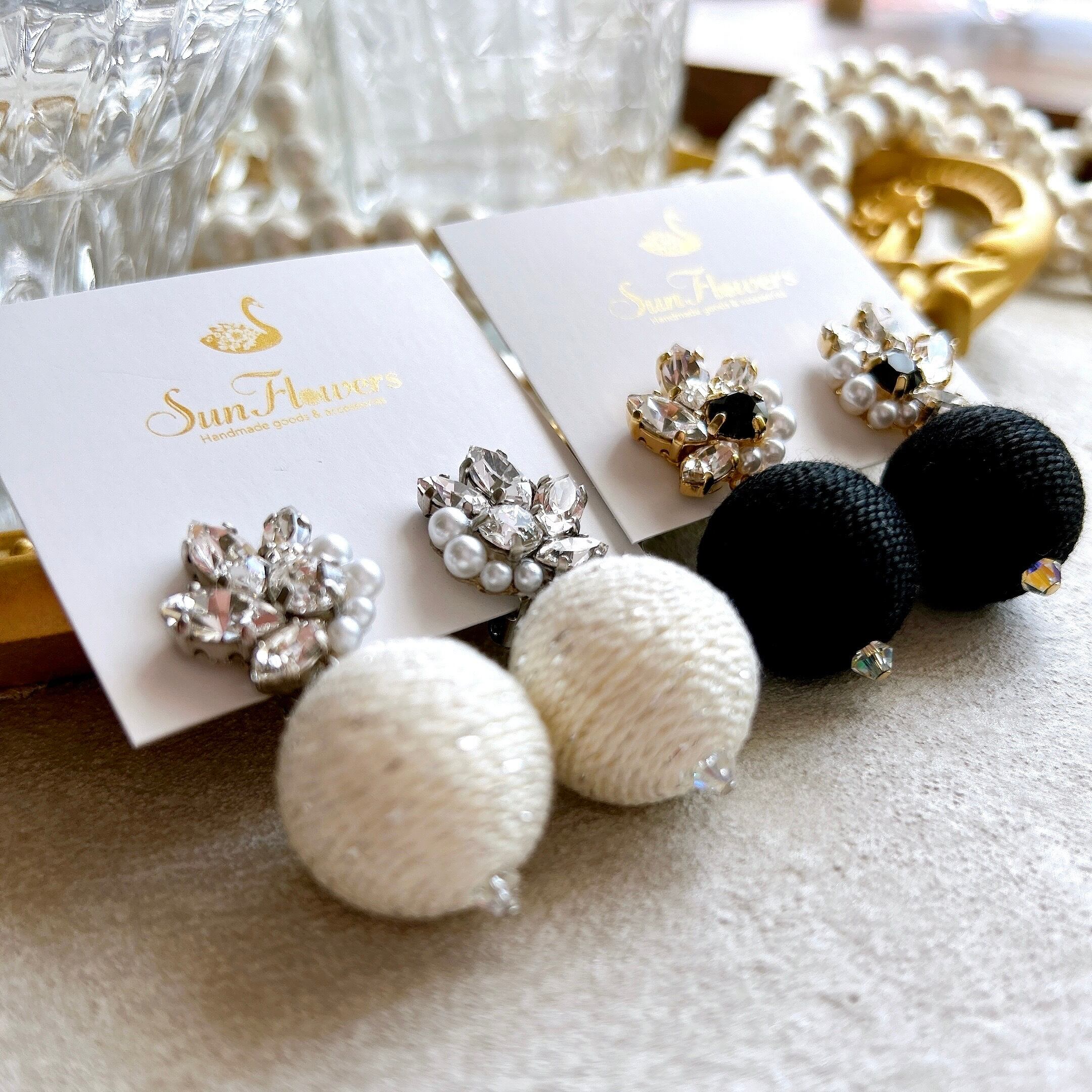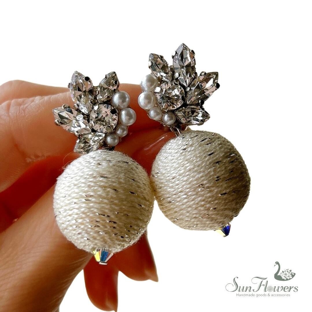 【白】煌めきモチーフ&ツイード調ボンボンピアス/イヤリング【再販】