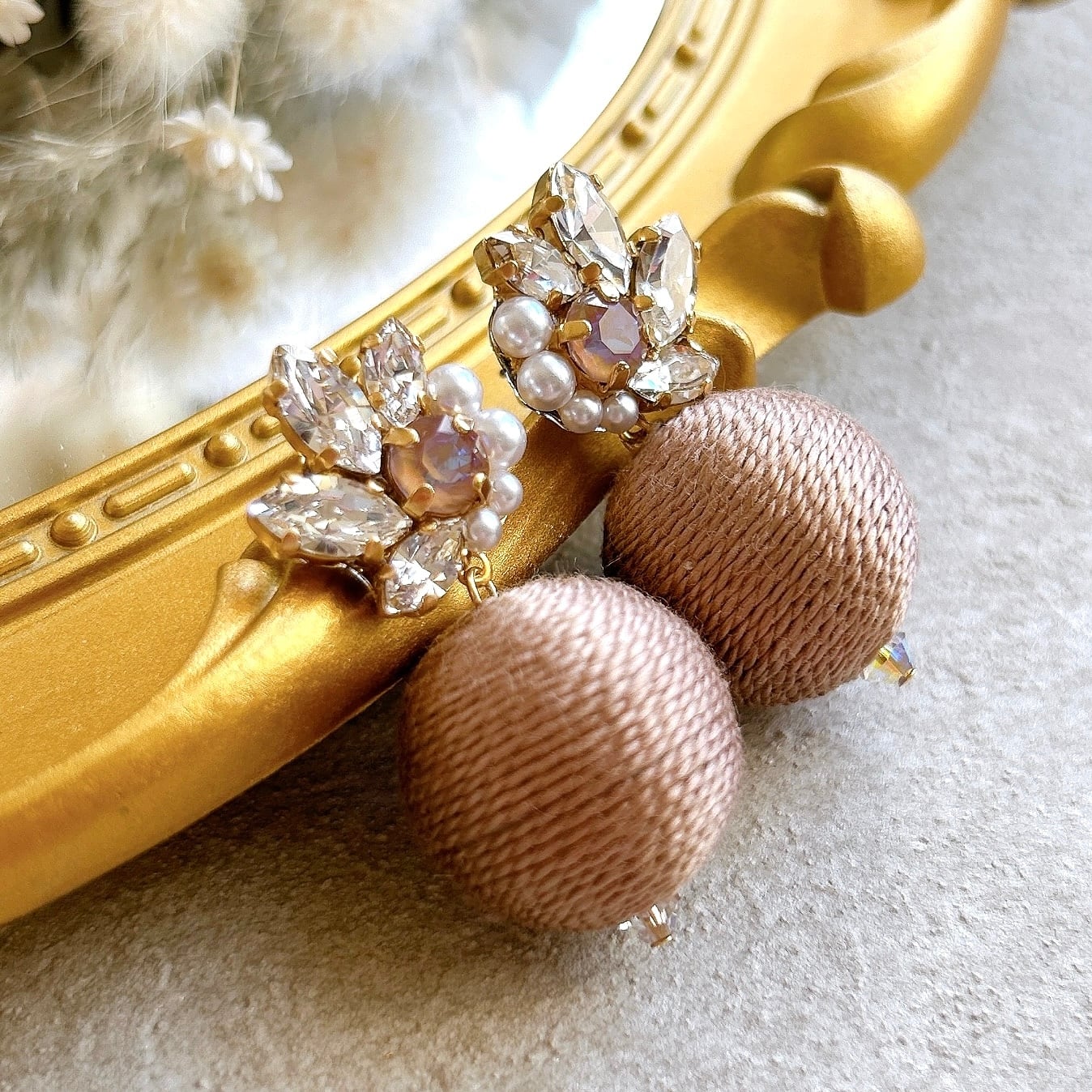 【ライトブラウン】煌めきモチーフ&ボンボンピアス/イヤリング